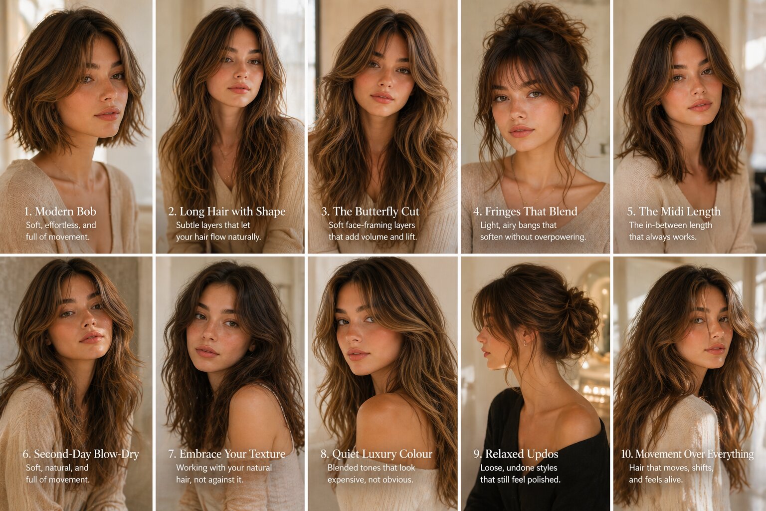 Think warm brunettes with depth, creamy blondes that catch light naturally. No harsh contrasts, no obvious lines.